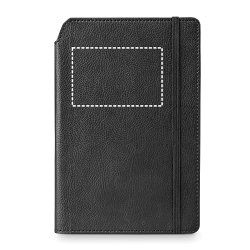Bloc-notes A5 avec couverture rigide en PU. Ce bloc-notes comporte 192 pages lignées (70 g/m²), fabriquées à partir de matériaux certifiés FSC™ et d'autres matériaux certifiés, un porte-stylo (stylo non inclus) et un élastique. Livré dans un sac non tissé. 140 x 210 mm