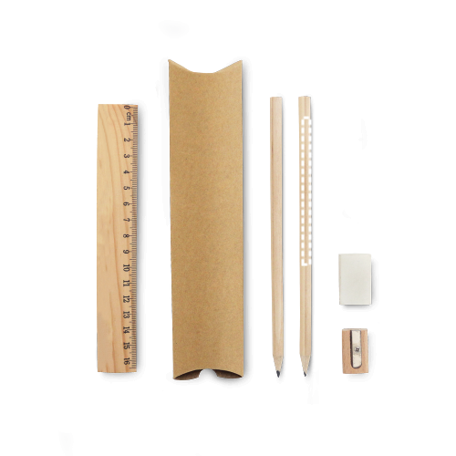 Set d'ecriture qui inclut une règle de 16'5cm, 2 crayons à papier HB, 1 gomme et 1 taille crayons. Livré dans un étui en carton. Étui: 190 x 45 x 20 mm