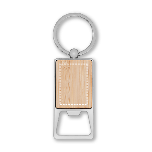 Porte-clés rectangulaire en fer composé d'alliage de zinc et de bambou. Un accessoire pratique avec décapsuleur intégré pour une utilisation facile en cas de besoin. Pochette en papier kraft. Le produit étant fabriqué à partir de matériaux naturels, la couleur du produit ainsi que le résultat de l'impression peuvent varier d'un produit à l'autre. Anneau : ø 32 mm | Produit : 67 x 31 x 4 mm | Total: 93 x 32 x 4 mm | Sac: 100 x 55 mm