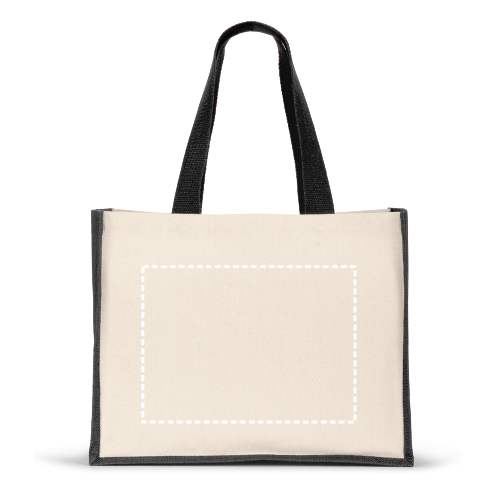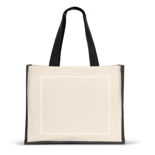 Sac en toile (320 g/m²), avec fond et côtés en jute laminé coloré (350 g/m²). Comprend des poignées de 60 cm. 420 x 330 x 190 mm